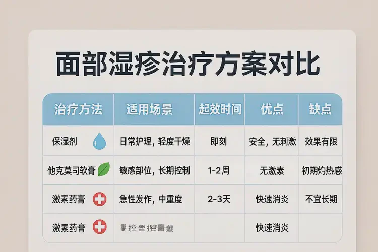 | 外用糖皮质激素 | 中重度炎症或急性期控制 | 数天 | 抗炎止痒起效快 | 长期/大面积可致皮肤萎缩 | 面部选低强度、短期使用 |