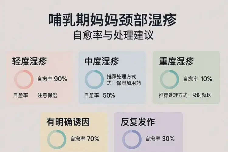 哺乳期的颈部湿疹属于慢性、炎症性、瘙痒性皮肤病,受遗传易感、皮肤屏障受损、免疫调节、环境因素共同影响。轻症在避免诱因后有机会缓解,但仅靠自愈往往迁延反复;中重度常需药物与护理联合干预以降低复发与并发症风险。
