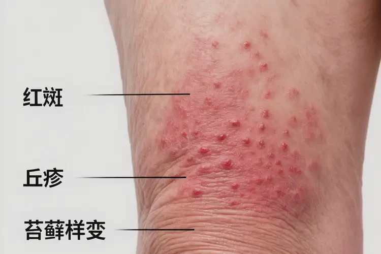 - 典型表现:大腿伸侧或内侧出现红斑、丘疹、渗出、苔藓样变,伴剧烈瘙痒,易因搔抓加重。