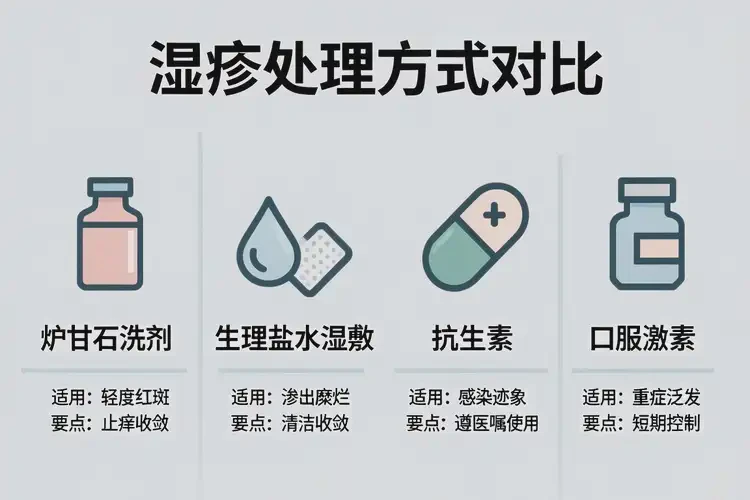 | 渗出/糜烂 | 生理盐水/硼酸溶液冷湿敷 | 每次10-20分钟,每日1-2次;渗出减少后转外用 |