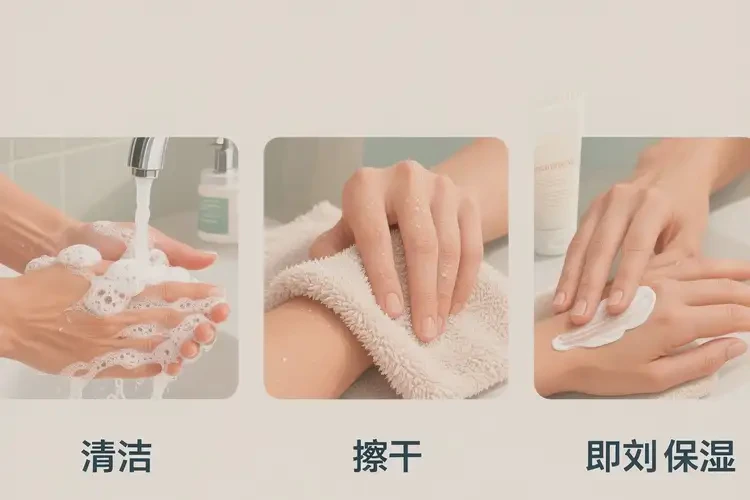 避免热水烫洗与用力搔抓;清洁后即刻保湿,选择成分简洁的润肤剂;减少接触刺激性清洁剂,必要时佩戴棉质内衬手套;保持适宜温湿度与情绪稳定。