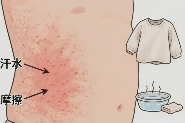 - 腹部好发原因:腹部贴身衣物摩擦、出汗不易散发、沐浴后未及时保湿等,常导致局部干燥—瘙痒—抓挠—炎症加重的循环。