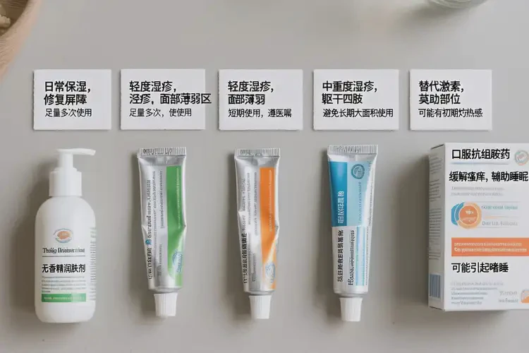 | 外用他克莫司/吡美莫司 | 抗炎、止痒(非激素) | 面部、颈部、皱褶等敏感部位或激素不耐受 | 局部不良反应少 | 初用可有短暂灼热/刺痒 | 儿童适用,按说明书与医嘱使用 |